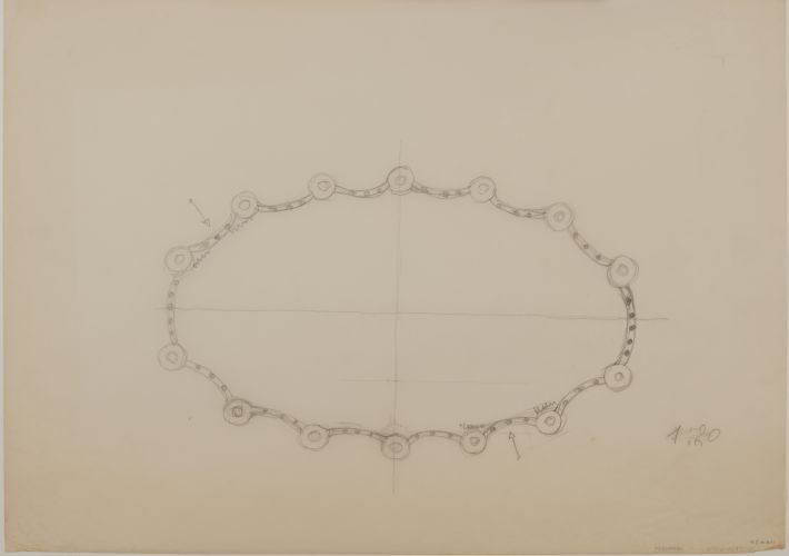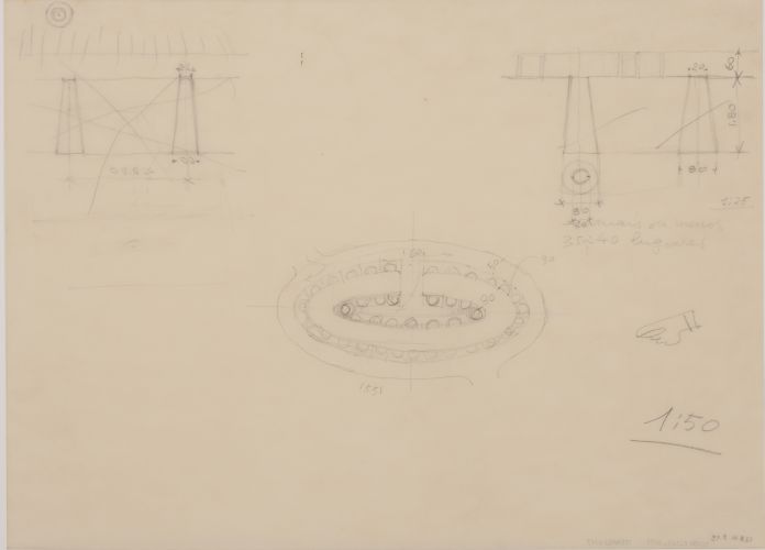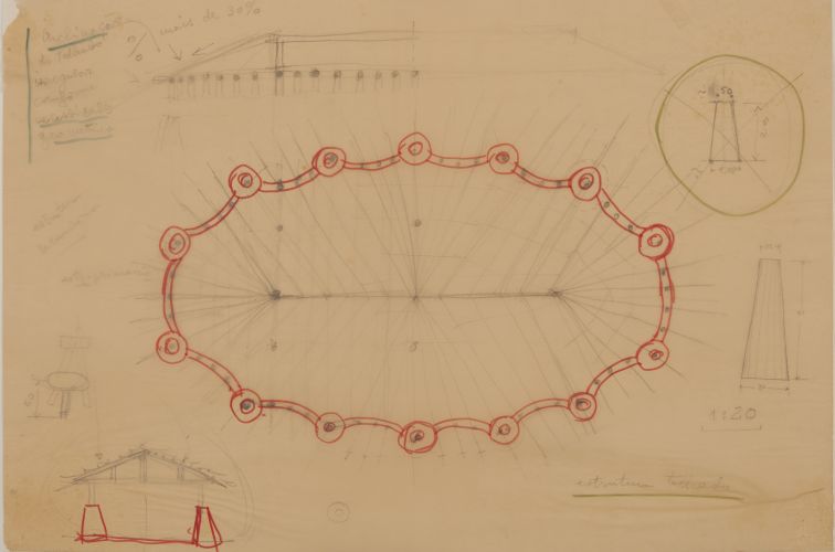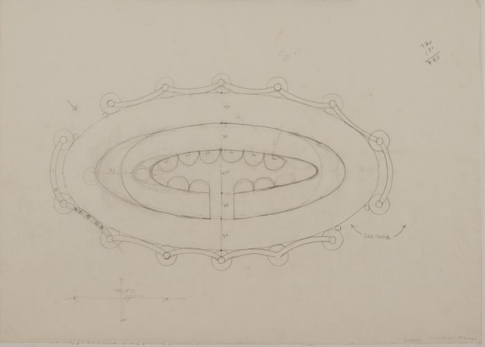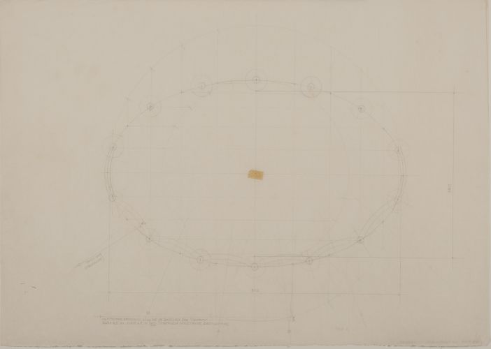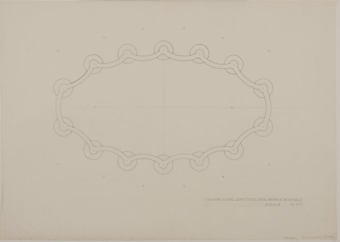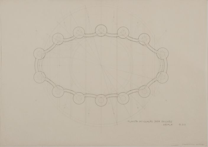 Detalhe em planta indicando configuração dos pilares em relação a geometria elíptica das paredes