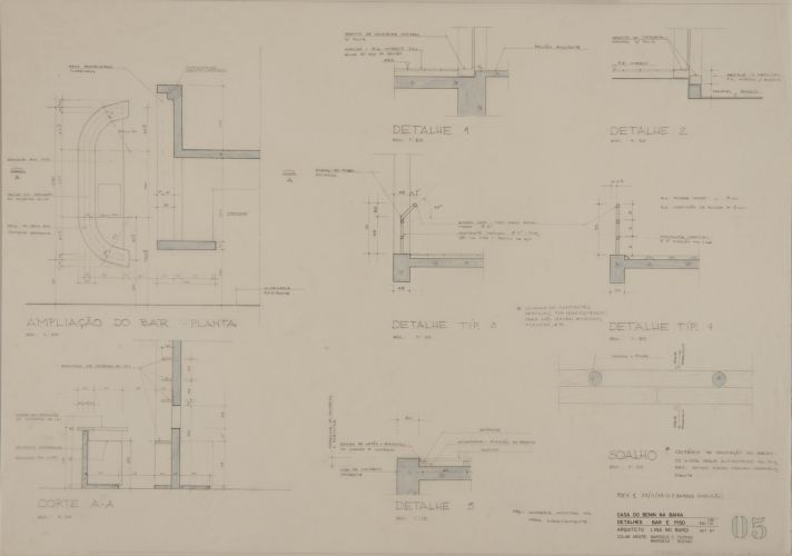 Detalhe em planta do balcão do bar, detalhe me corte do balcaão do bar, detalhes do guarda corpo, detalhe do piso