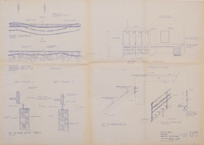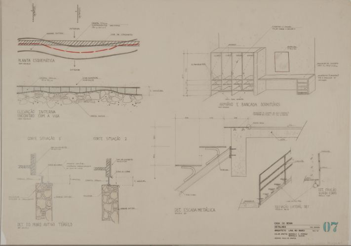 Detalhe em planta do encontro, viga/vidro/parede antica, detalhe em corte do encontro, viga/vidro/parede, detalhe escada / Perspectiva mobiliário dos quartos