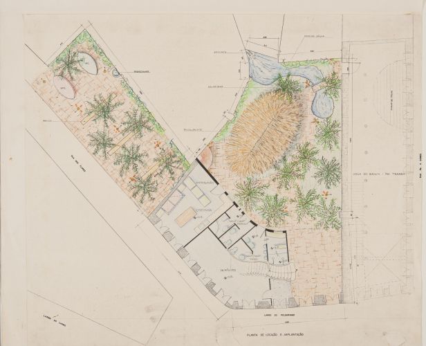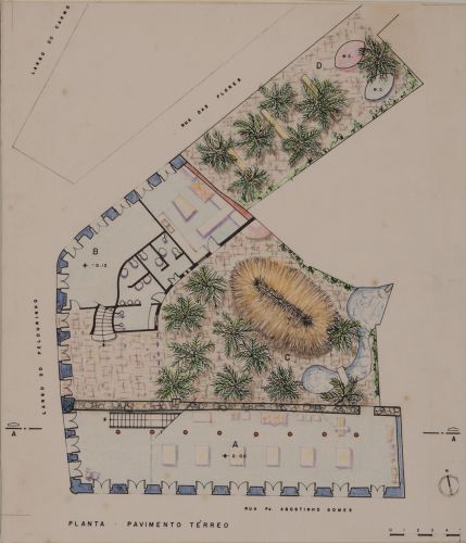 Planta do térreo indicando layou de mobiliário, vegetação e tipos de piso